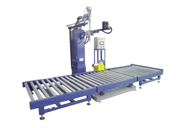 人工上桶→人工对孔→自动灌装→人工放盖压盖→移载满桶→人工码垛